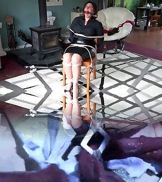 Tantalizing nerdy chick with chubby curves in the bondage action