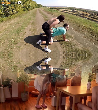 A shaved, bearded and hairy male is cruel to his gorgeous mature wife for the amusement of people))